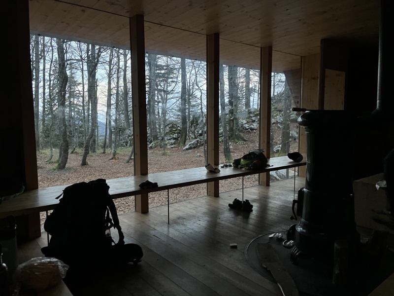 S přicházejícím šerem jsme se za každým šutrem obávali medvěda, ale ti měli na práci patrně něco zajímavějšího než děsit jednu funící rodinu Hájků. A pak! Dobro došli, útulna byla odemčená, prázdná a krásná! Chvíli po nás dorazili ještě dva chorvatští kluci, co asi úplně familku se dvěma kindoši nečekali, ale nějak to s námi přežili. Ráno, když jsme se všichni navlékli do žlutých nepromokavých oblečků (protože v noci započala průtrž mračen), Filipa zastrčili za můj batoh, měli kuci chorvatští o zážitek vystaráno. Pro sestup už jsme moudře zvolili cestu kratší, abychom nepromrhali zbytečně to chvilkové okno bez deště. Průzkum skal nad útulnou si budeme muset nechat holt na jindy.